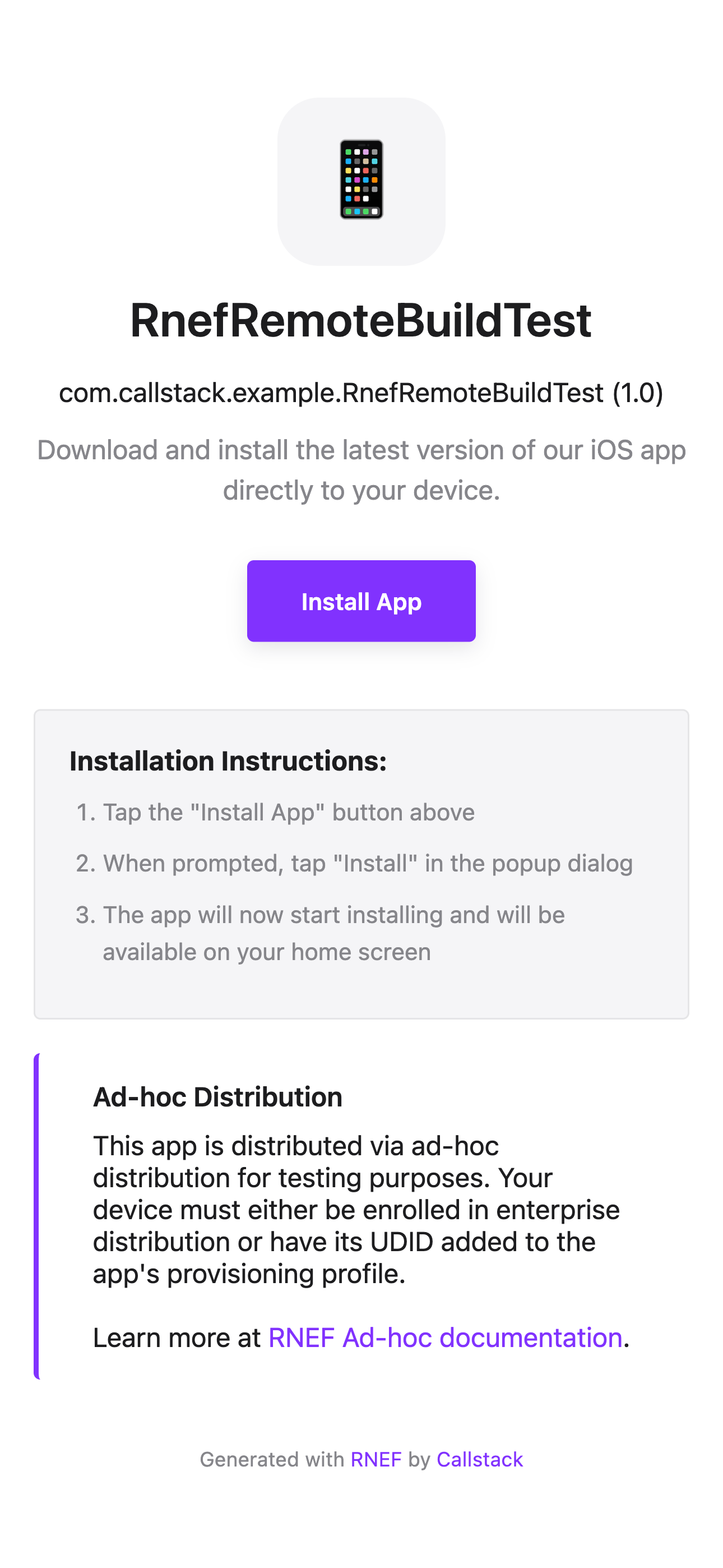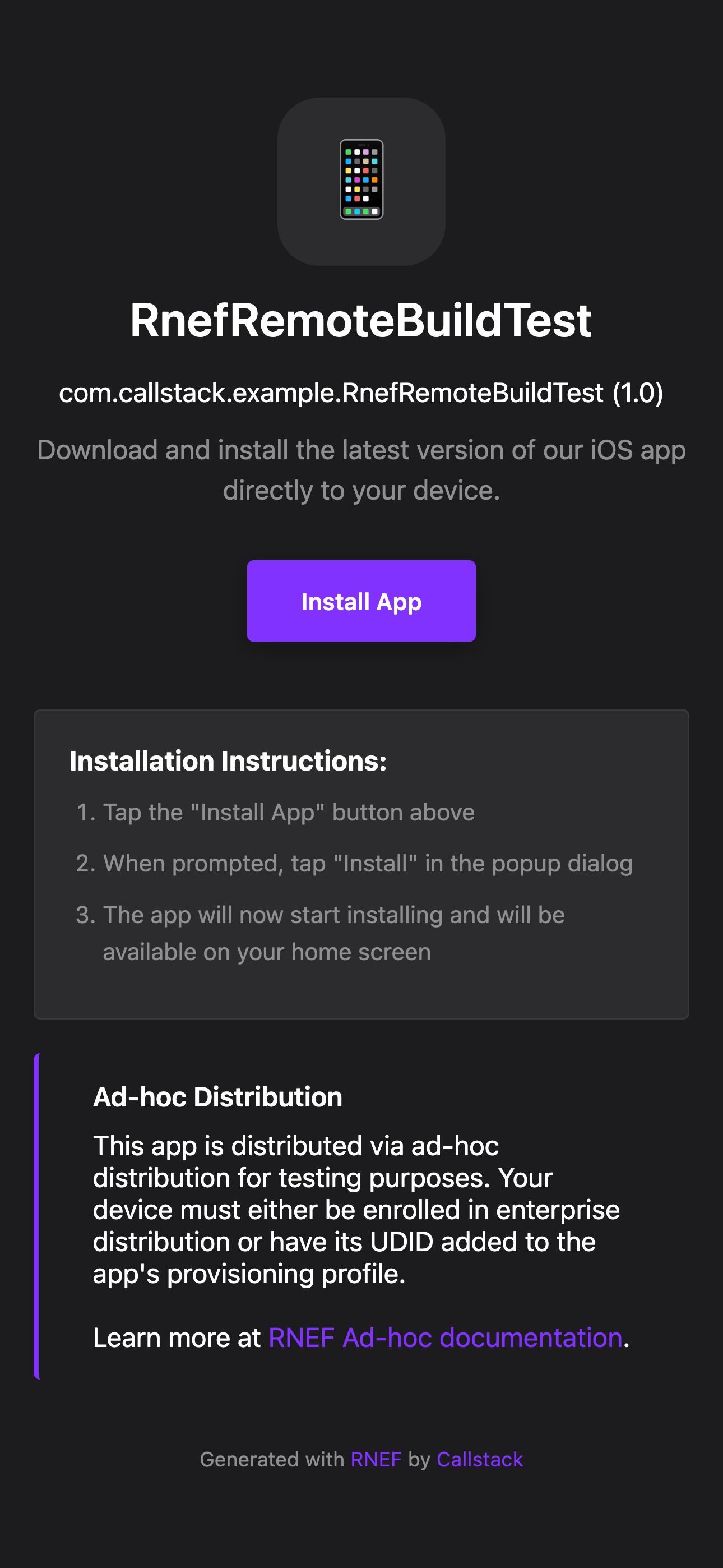 file will display an ad-hoc distribution web portal, allowing developers and testers to install apps on their provisioned devices by simply clicking "Install App".